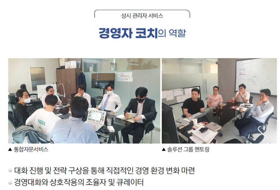 • 경영자 코치는 1인 1사 방식의 중소기업 전담자로서 경영 현황을 파악하여 사업 성장에 직접적으로 도움이 되도록 협회 전문가 서비스를 매칭합니다.