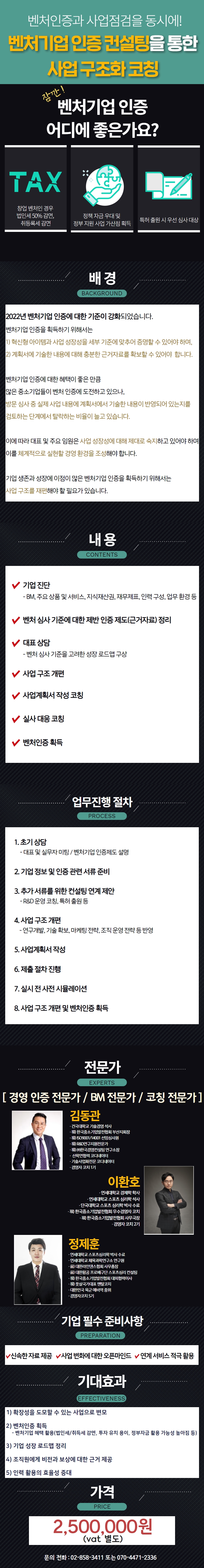 혁신성장형 기업(벤처기업)으로 발돋움할수 있도록 세심한 벤처인증 획득 전략 코칭과 연구소설립을 통한 특허 출원을 통해 빠르게 인증을 달성할수 있게 해주셔서 감사합니다. 단순컨설팅을 넘어 기업의 성장로드맵을 통한 경영인의 멘탈코칭까지 서비스로 해주셔서 기업성장원리를 깨우칠수 있는 시간이었습니다. 감사합니다^^